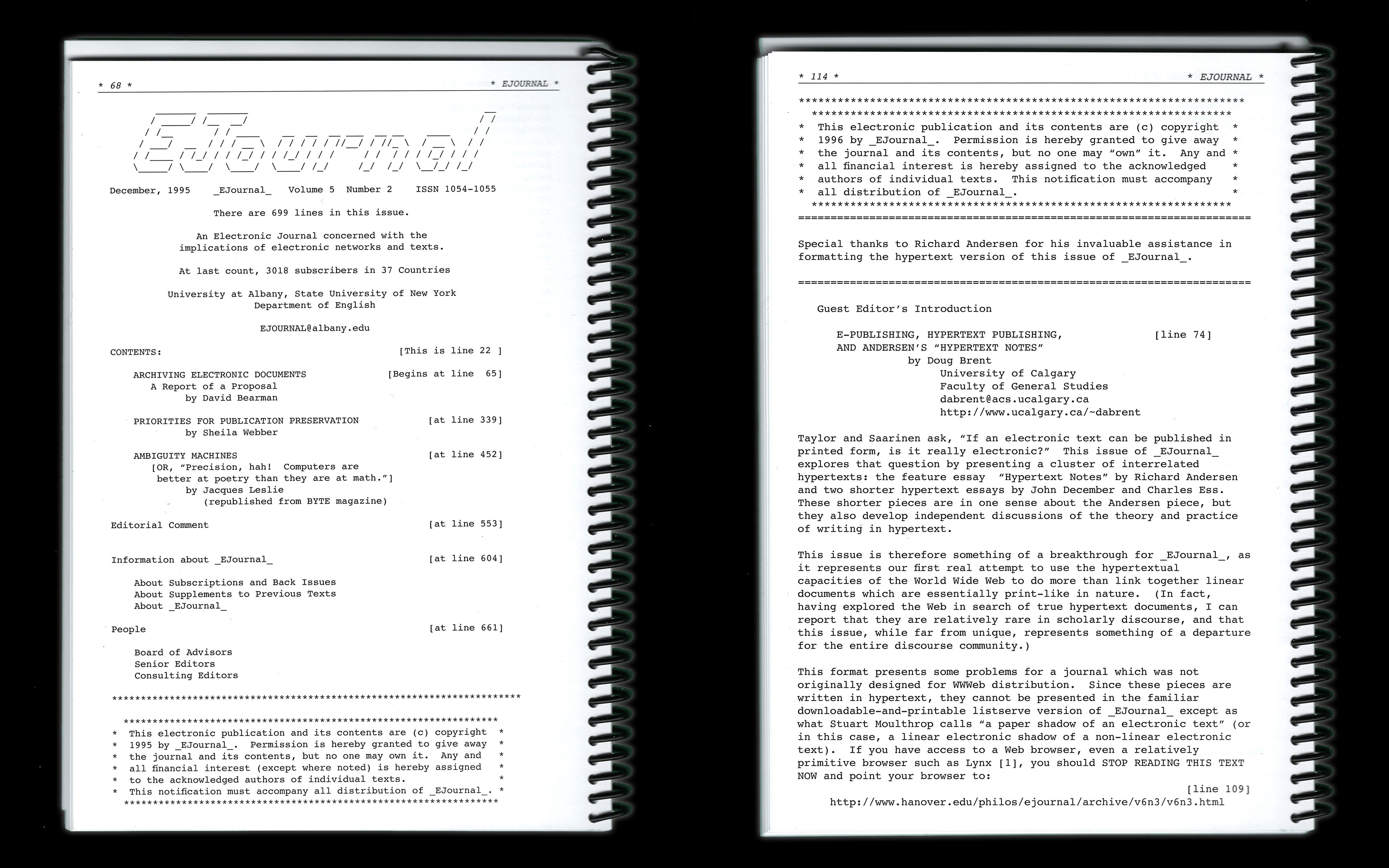 EJOURNAL was an academic journal published electronically out of the University of Albany, it discussed issues of ownership, personal expression, and the electronic dissemination of information. Reproduced from an online archive and formatted for print, EJOURNAL was originally distributed online exclusively, the books together contain the entire EJOURNAL run.